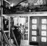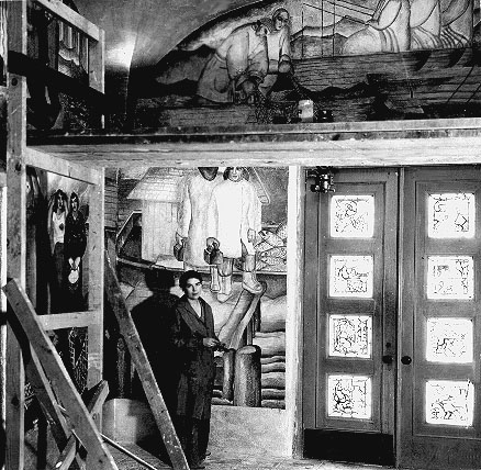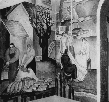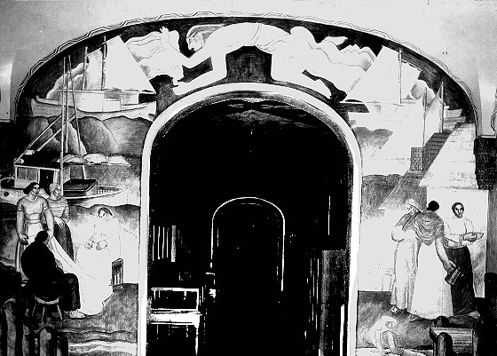 These murals were painted in the Exhibition Hall Foyer of the School of Architecture and Allied Arts, University of Oregon, Eugene, in 1932. This building was later torn down and replaced by a newer one, so the murals were destroyed. This photographic record remains...